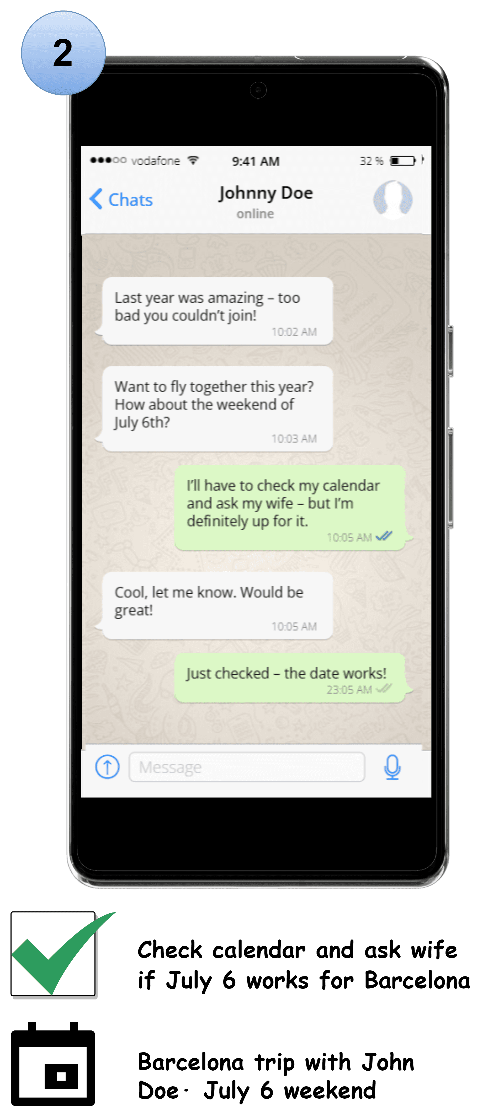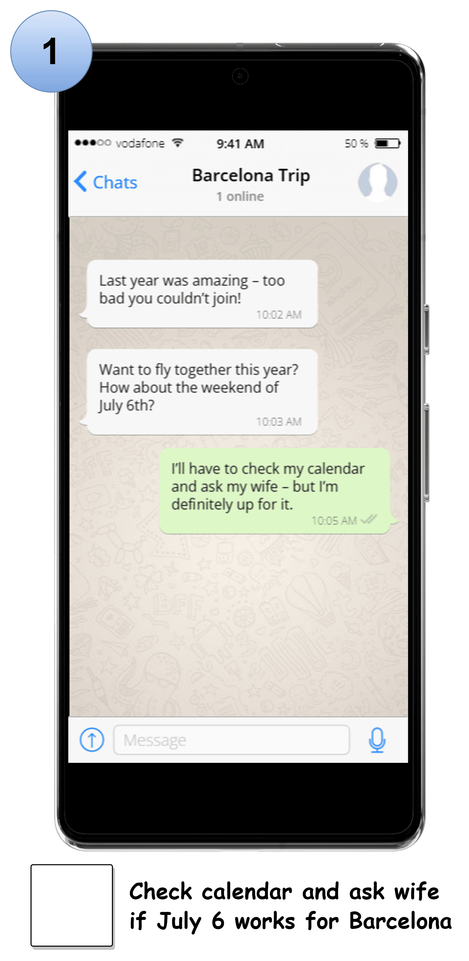 In this short WhatsApp exchange, Kim recognizes that a trip is being planned for early July.