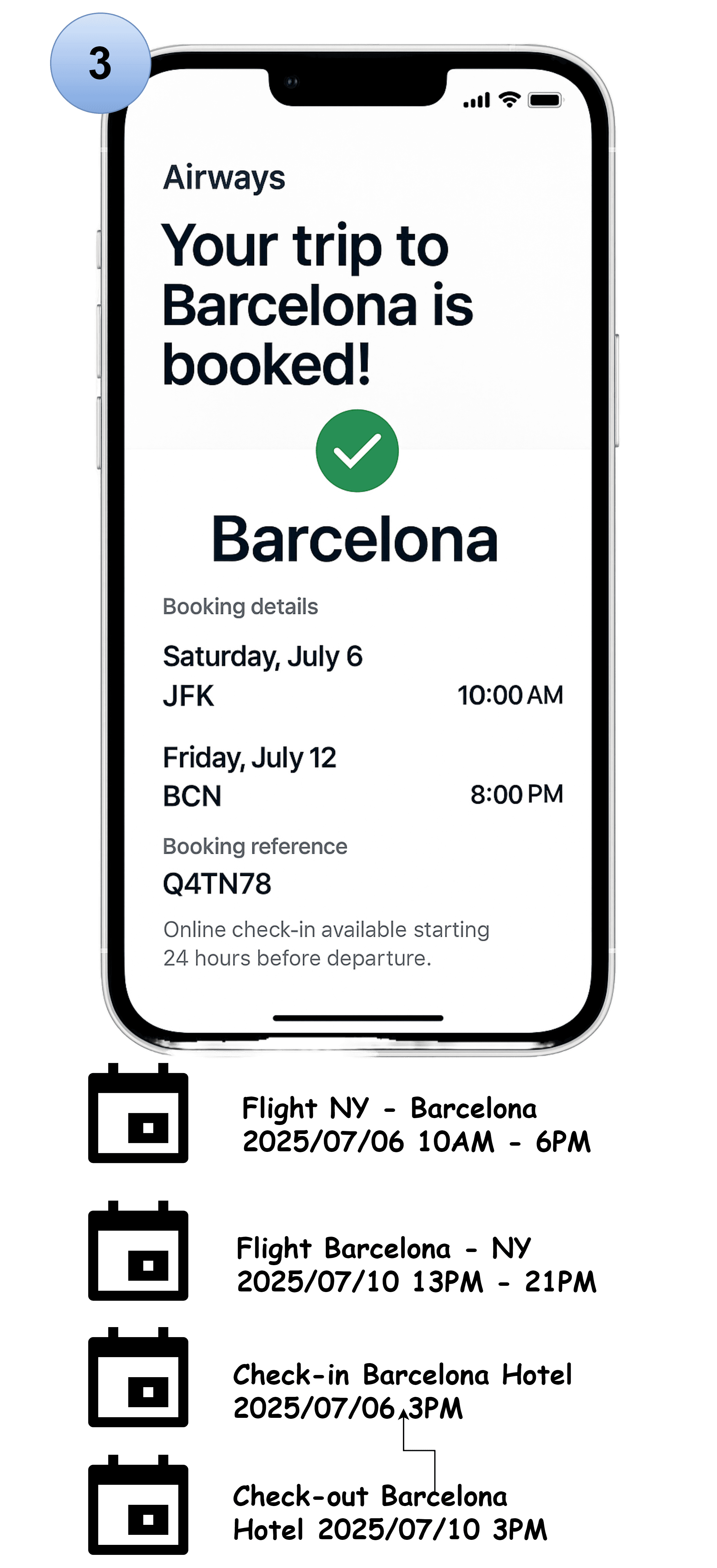 After the date was set, the user started forwarding flight and hotel confirmations as screenshots.