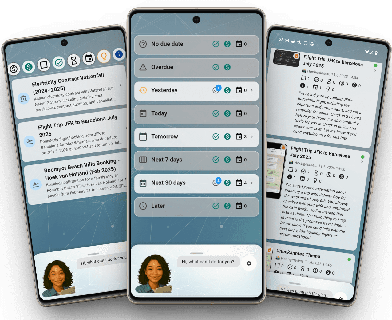 Kim analyzes your screenshot and figures out what matters. Deadlines, payments, events, todos, or useful info – Kim extracts the essentials and sorts everything into clear categories. But she goes further: related items like flights, bookings, and check-ins are grouped into meaningful journeys or themes. Already captured something? Kim updates existing events if details change or marks todos as done when they’re completed. No double work, no chaos.